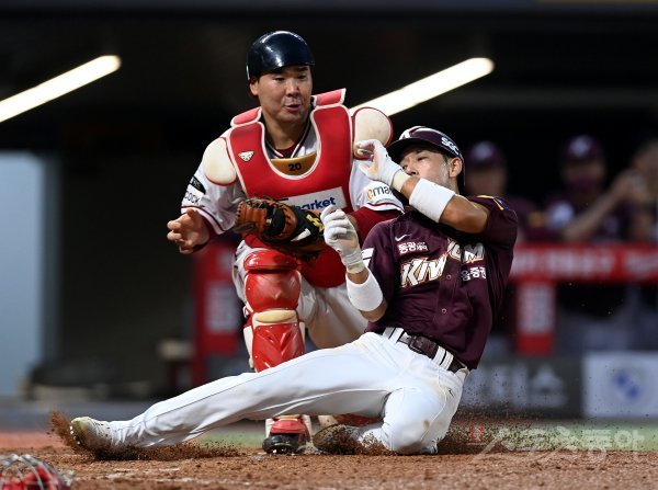 12일 인천 SSG 랜더스필드에서 ‘2022 신한은행 SOL KBO리그’ SSG 랜더스와 키움 히어로즈의 경기가 열렸다. 5회초 1사 1, 2루에서 안타 때 키움 2루 주자 이용규가 홈으로 파고 들었으나 SSG 이재원에게 태그 아웃되고 있다.