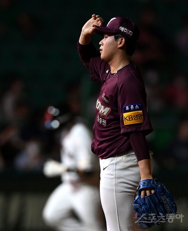 12일 인천 SSG 랜더스필드에서 ‘2022 신한은행 SOL KBO리그’ SSG 랜더스와 키움 히어로즈의 경기가 열렸다. 6회말 2사 2, 3루에서 역전 홈런을 허용한 키움 이명종이 아쉬워하고 있다.