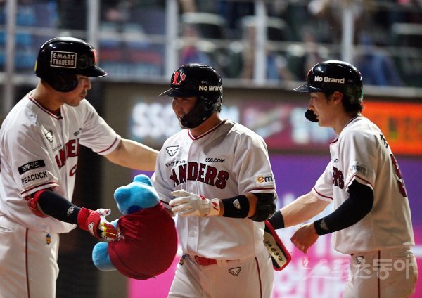 12일 인천 SSG 랜더스필드에서 ‘2022 신한은행 SOL KBO리그’ SSG 랜더스와 키움 히어로즈의 경기가 열렸다. 6회말 2사 2, 3루에서 SSG 최정이 역전 3점 홈런을 쏘아 올린 후 동료들의 환영을 받고 있다.