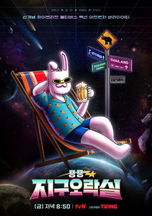 tvN ‘뿅뿅 지구오락실’은 지구로 도망간 달나라 토끼를 잡기 위해 뭉친 4명의 용사가 시공간을 넘나들며 펼치는 신개념 하이브리드 멀티버스 액션 어드벤처 버라이어티다. 게임에 과몰입하는 지구 용사들과 이에 지쳐가는 제작진 케미스트리(호흡)가 큰 웃음을 선사하고 있다. 또 TV 화제성 분석 기관 굿데이터코퍼레이션이 발표한 비드라마 화제성 부문에서 2주 연속 1위를 기록하고, 2회 연속 자체 최고시청률도 경신한 상태다.