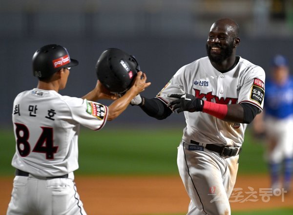 12일 수원KT위즈파크에서 ‘2022 신한은행 MY CAR KBO리그’ 삼성 라이온즈와 KT 위즈 경기가 열렸다. 9회말 무사 KT 알포드가 끝내기 홈런을 날리고 그라운드르를 돌며 하이파이브 하고 있다.