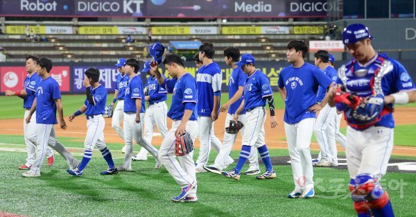 12일 수원KT위즈파크에서 ‘2022 신한은행 MY CAR KBO리그’ 삼성 라이온즈와 KT 위즈 경기가 열렸다. 3-4 역전패를 당하며 10연패에 빠진 삼성 선수들이 그라운드를 빠져나가고 있다. 수원 | 김종원 기자 won@donga.com