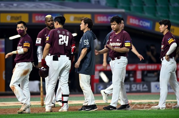 12일 인천 SSG 랜더스필드에서 ‘2022 신한은행 SOL KBO리그’ SSG 랜더스와 키움 히어로즈의 경기가 열렸다. SSG에 3-7로 패한 키움 선수들이 아쉬워하고 있다.