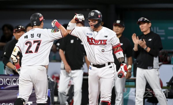 12일 수원KT위즈파크에서 ‘2022 신한은행 MY CAR KBO리그’ 삼성 라이온즈와 KT 위즈 경기가 열렸다. 9회말 무사 KT 배정대가 동점 좌월 솔로 홈런을 날리고 그라운드르를 돌아 홈인해 박병호의 축하를 받고 있다.