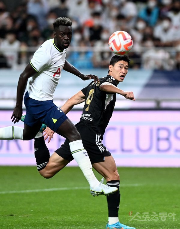 13일 서울 월드컵경기장에서 잉글랜드 프로축구 프리미어리그 ‘토트넘’과 K리그 올스타 ‘팀 K리그’의 경기가 열렸다. 팀 K리그 조규성이 헤딩슛을 노렸으나 골대를 벗어나고 있다.