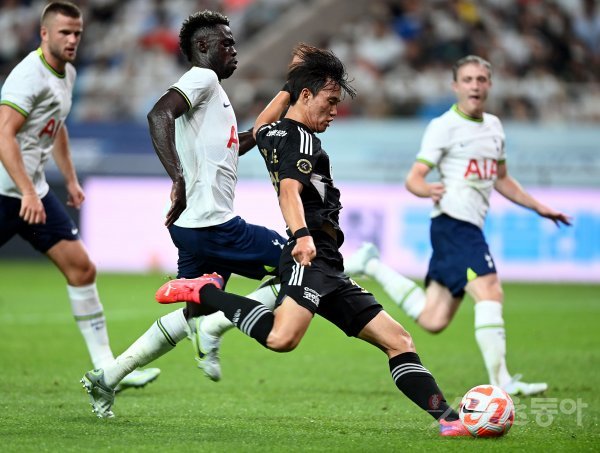 13일 서울 월드컵경기장에서 잉글랜드 프로축구 프리미어리그 ‘토트넘’과 K리그 올스타 ‘팀 K리그’의 경기가 열렸다. 팀 K리그 양현준이 슛을 날리고 있다.