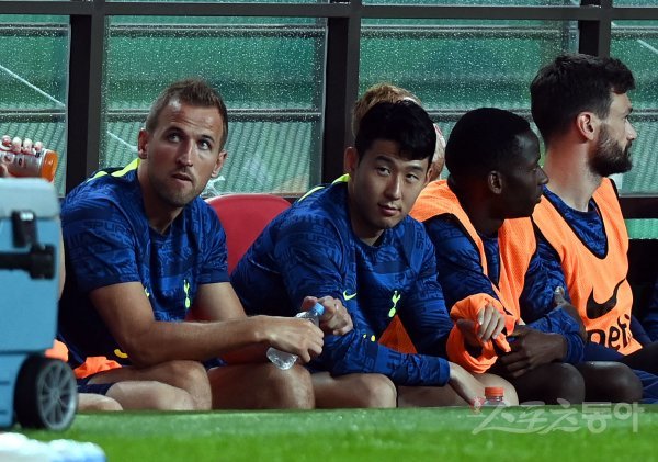 13일 서울 월드컵경기장에서 잉글랜드 프로축구 프리미어리그 ‘토트넘’과 K리그 올스타 ‘팀 K리그’의 경기가 열렸다. 토트넘 손흥민과 케인이 벤치에서 경기를 지켜보고 있다.