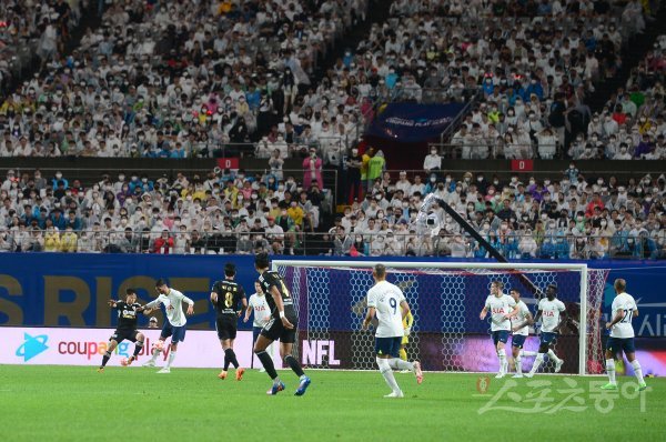 13일 서울월드컵경기장에서 열린 쿠팡플레이 시리즈 ‘팀 K리그와 토트넘 홋스퍼’의 프리시즌 매치데이에서 양 팀 선수들이 6만 관중 앞에서 경기를 펼치고 있다.