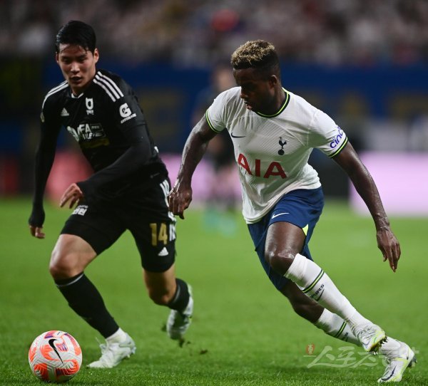 13일 서울월드컵경기장에서 열린 쿠팡플레이 시리즈 ‘팀 K리그와 토트넘 홋스퍼’의 프리시즌 매치데이에서 토트넘 세세뇽이 팀 K리그 박승욱의 수비를 뚫고 드리블 돌파하고 있다.