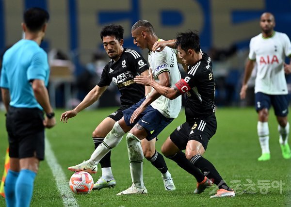 13일 서울 월드컵경기장에서 잉글랜드 프로축구 프리미어리그 ‘토트넘’과 K리그 올스타 ‘팀 K리그’의 경기가 열렸다. 토트넘 히샬리송이 팀 K리그 선수들과 볼 다툼을 벌이고 있다.
