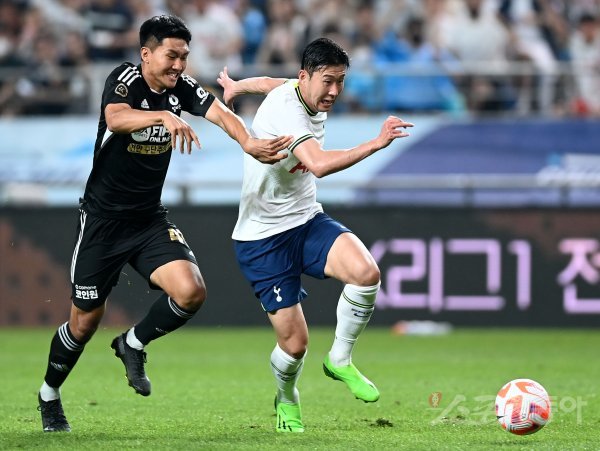 13일 서울 월드컵경기장에서 잉글랜드 프로축구 프리미어리그 ‘토트넘’과 K리그 올스타 ‘팀 K리그’의 경기가 열렸다. 토트넘 손흥민이 팀 K리그 김동민의 수비를 제치며 돌파하고 있다.