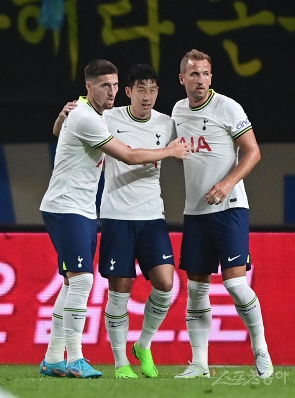 13일 서울월드컵경기장에서 열린 쿠팡플레이 시리즈 ‘팀 K리그와 토트넘 홋스퍼’의 프리시즌 매치데이에서 토트넘 해리 케인이 팀 내 세 번째 골을 성공시킨 후 맷 도허티, 손흥민과 기쁨을 나누고 있다.