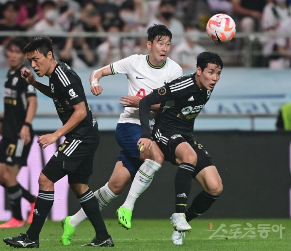 13일 서울월드컵경기장에서 열린 쿠팡플레이 시리즈 ‘팀 K리그와 토트넘 홋스퍼’의 프리시즌 매치데이에서 토트넘 손흥민이 팀 K리그 박승욱과 몸싸움을 하고 있다.