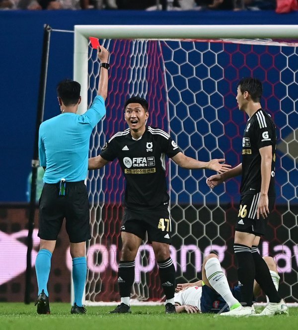 13일 서울월드컵경기장에서 열린 쿠팡플레이 시리즈 ‘팀 K리그와 토트넘 홋스퍼’의 프리시즌 매치데이에서 팀 K리그 김동민이 심판으로부터 레드카드를 받자 어필하고 있다.