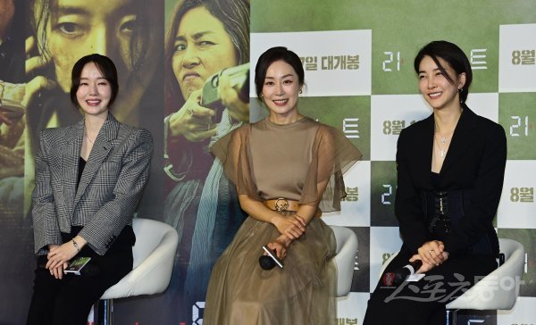 배우 이정현, 문정희, 진서연이 14일 서울 광진구 자양동 롯데시네마 건대입구점에서 열린 영화 ‘리미트’ 제작보고회에서 동료의 답변에 웃고 있다.