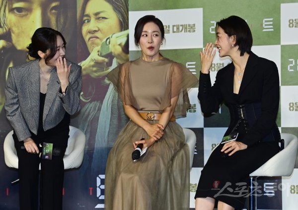 배우 이정현, 문정희, 진서연이 14일 서울 광진구 자양동 롯데시네마 건대입구점에서 열린 영화 ‘리미트’ 제작보고회에서 이야기를 하고 있다.