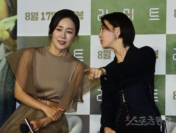 배우 문정희와 진서연이 14일 서울 광진구 자양동 롯데시네마 건대입구점에서 열린 영화 ‘리미트’ 제작보고회에서 이야기를 하고 있다.