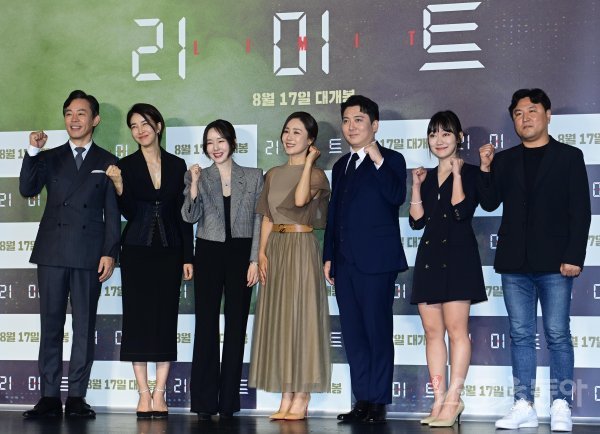 배우 최덕문, 진서연, 이정현, 문정희, 박명훈, 박경혜, 이승준 감독이 14일 서울 광진구 자양동 롯데시네마 건대입구점에서 열린 영화 ‘리미트’ 제작보고회에서 포즈를 취하고 있다.