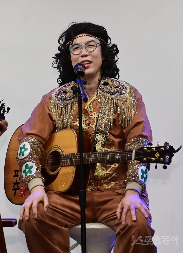가수 겸 개그맨 카피추가 14일 서울 마포구 서교동 윤형빈소극장에서 열린 신곡 ‘내 지갑에 있는 돈 다 갖다써라’ 발매 기념 쇼케이스에서 취재진의 질문에 답하고 있다.