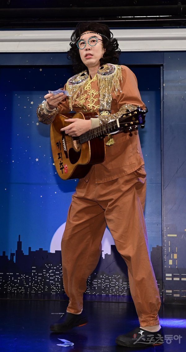 가수 겸 개그맨 카피추가 14일 서울 마포구 서교동 윤형빈소극장에서 열린 신보 ‘내 지갑에 있는 돈 다 갖다써라’ 발매 기념 쇼케이스에서 신곡을 부르고 있다.