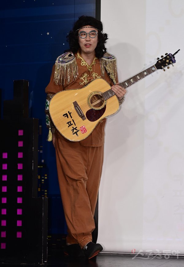 가수 겸 개그맨 카피추가 14일 서울 마포구 서교동 윤형빈소극장에서 열린 신곡 ‘내 지갑에 있는 돈 다 갖다써라’ 발매 기념 쇼케이스 무대에 오르고 있다.