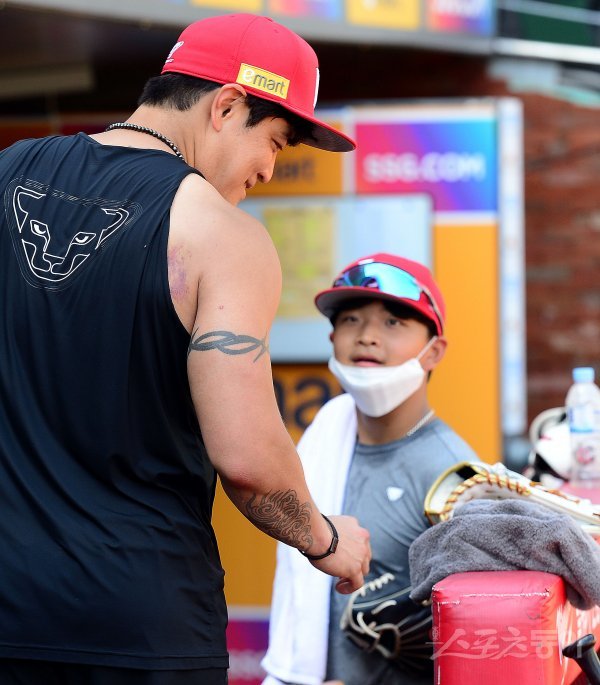 14일 인천 SSG 랜더스필드에서 ‘2022 신한은행 SOL KBO리그’ SSG 랜더스와 키움 히어로즈의 경기가 열린다. 경기 전 SSG 추신수가 아들 추건우와 이야기를 나누고 있다.