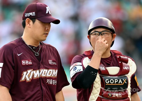 14일 인천 SSG 랜더스필드에서 ‘2022 신한은행 SOL KBO리그’ SSG 랜더스와 키움 히어로즈의 경기가 열렸다. 2회말 만루 위기를 1실점으로 막은 키움 선발 정찬헌이 이닝 종료 후 이지영과 이야기를 나누구 있다.