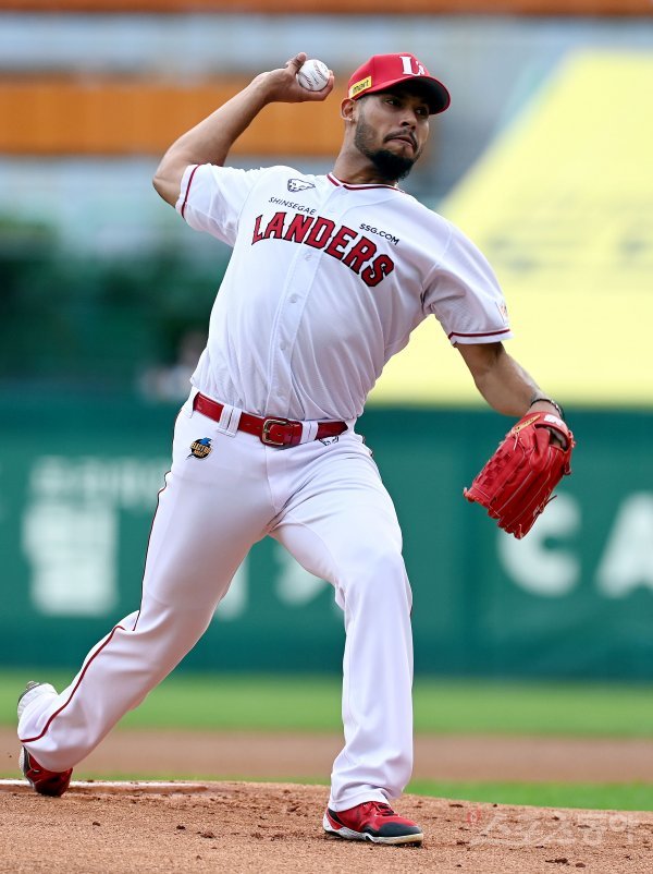 14일 인천 SSG 랜더스필드에서 ‘2022 신한은행 SOL KBO리그’ SSG 랜더스와 키움 히어로즈의 경기가 열렸다. SSG 선발투수 폰트가 힘차게 볼을 던지고 있다.
