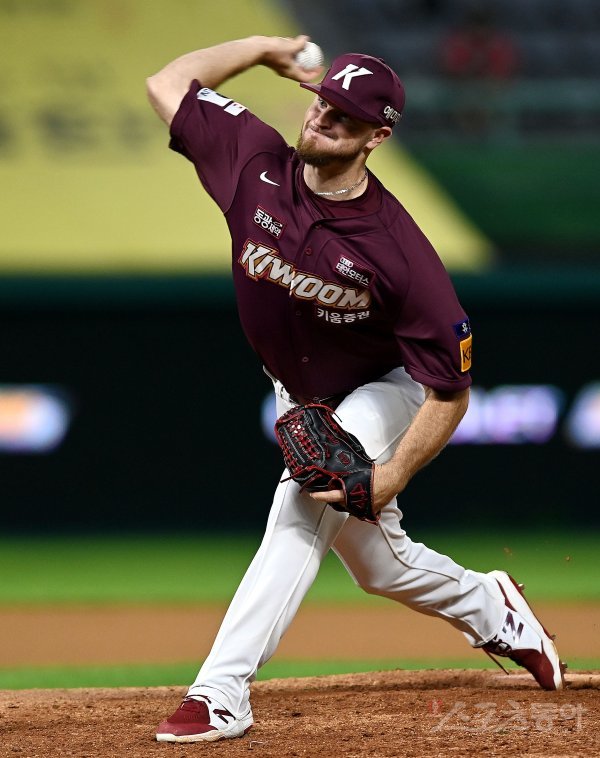 14일 인천 SSG 랜더스필드에서 ‘2022 신한은행 SOL KBO리그’ SSG 랜더스와 키움 히어로즈의 경기가 열렸다. 6회말 2사 2, 3루에서 키움 애플러가 구원 등판해 볼을 던지고 있다.