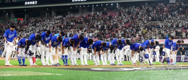 14일 수원KT위즈파크에서 ‘2022 신한은행 MY CAR KBO리그’ 삼성 라이온즈와 KT 위즈 경기가 열렸다. 0-1로 패하며 11연패에 빠진 삼성 선수들이 팬들에게 인사하고 있다. 수원 | 김종원 기자 won@donga.com