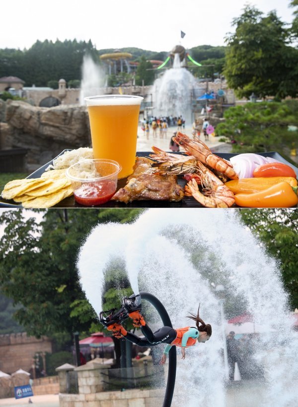 생맥주를 즐길 수 있다(위 사진). 25일부터 야외 파도풀에서 진행하는 메가 플라이보드쇼. 세계 챔피언인 박진민 선수를 비롯한