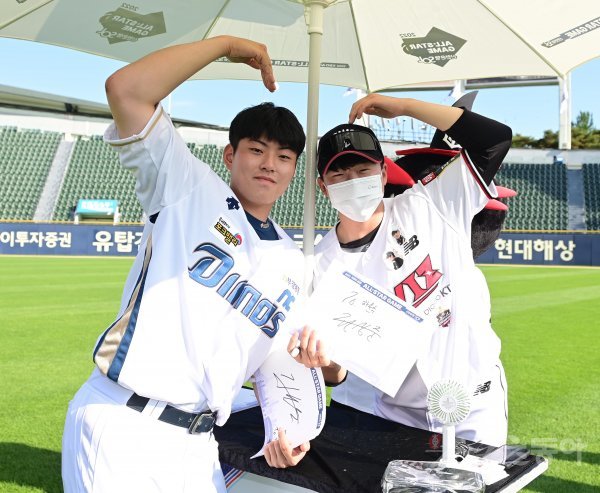 15일 서울 잠실야구장에서 열린 ‘2022 KBO 퓨처스리그 올스타전’ 북부리그와 남부리그의 경기에 앞서 NC 하준수가 KT 권성준에게 사인을 받은 후 포즈를 취하고 있다.