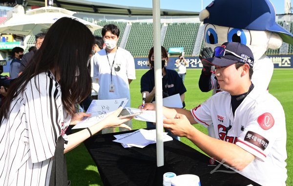 15일 서울 잠실야구장에서 열린 ‘2022 KBO 퓨처스리그 올스타전’ 북부리그와 남부리그의 경기에 앞서 롯데 조세진이 팬 사인회를 하고 있다.