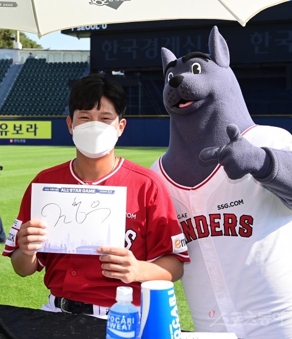 15일 서울 잠실야구장에서 열린 ‘2022 KBO 퓨처스리그 올스타전’ 북부리그와 남부리그의 경기에 앞서 SSG 조형우가 팬 사인회에서 포즈를 취하고 있다.
