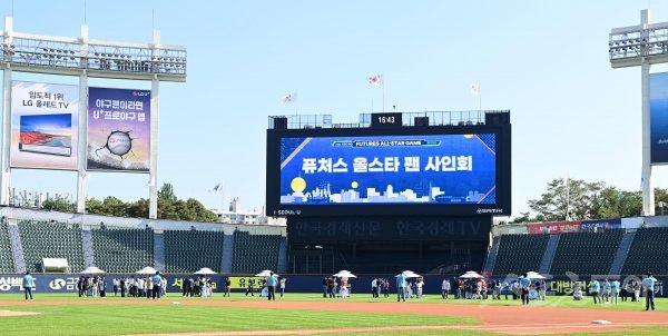 15일 서울 잠실야구장에서 열린 ‘2022 KBO 퓨처스리그 올스타전’ 북부리그와 남부리그의 경기에 앞서 8개 구단 선수들이 팬 사인회를 하고 있다.
