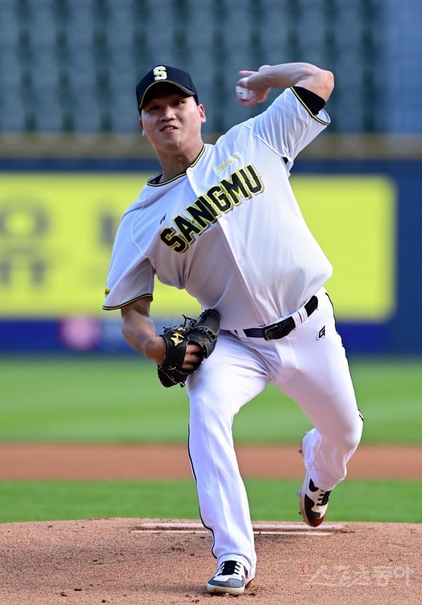 15일 서울 잠실야구장에서 열린 ‘2022 KBO 퓨처스리그 올스타전’ 북부리그와 남부리그의 경기에서 선발 투수로 마운드에 오른 상무 김기훈이 역투하고 있다.