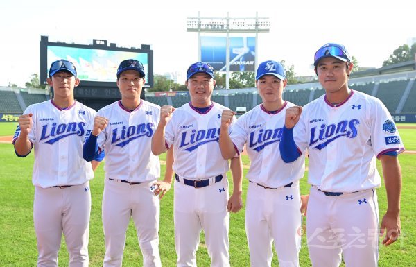 15일 서울 잠실야구장에서 열린 ‘2022 KBO 퓨처스리그 올스타전’ 북부리그와 남부리그의 경기에 앞서 삼성 허윤동, 이병헌, 박진만 코치, 박승규, 공민규가 포즈를 취하고 있다.
