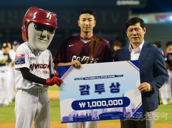 15일 서울 잠실야구장에서 열린 ‘2022 KBO 퓨처스리그 올스타전’ 북부리그와 남부리그의 경기에서 남부리그에 2-3으로 패한 북부리그 주승우가 감투상을 수상해 허구연 총재와 기념 촬영을 하고 있다.