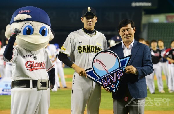 15일 서울 잠실야구장에서 열린 ‘2022 KBO 퓨처스리그 올스타전’ 북부리그와 남부리그의 경기에서 남부리그가 3-2로 북부리그에 승리한 후 나승엽이 MVP를 수상해 허구연 총재와 기념 촬영을 하고 있다.