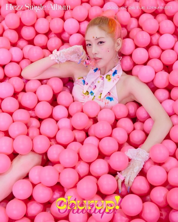 사진 속 Hezz는 볼풀장에 속에 누워 카메라를 응시하고 있다. 브릿지로 포인트를 준 헤어스타일과 화려한 메이크업으로 펑키한 느낌을 가득 담은 비주얼로 변신했다.