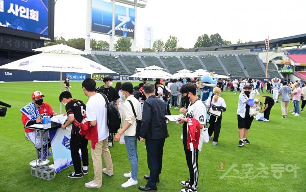 16일 서울 잠실야구장에서 열린 ‘2022 KBO 올스타전’ 드림 올스타와 나눔 올스타의 경기에 앞서 10개 구단 선수들이 팬 사인회를 하고 있다.