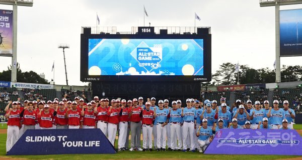 16일 서울 잠실야구장에서 열린 ‘2022 KBO 올스타전’ 드림 올스타와 나눔 올스타의 경기에 앞서 양 팀 선수들이 포즈를 취하고 있다.