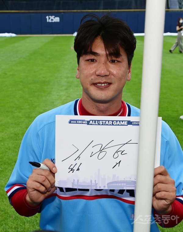 16일 서울 잠실야구장에서 열린 ‘2022 KBO 올스타전’ 드림 올스타와 나눔 올스타의 경기에 앞서 SSG 김광현이 팬 사인회에서 포즈를 취하고 있다.