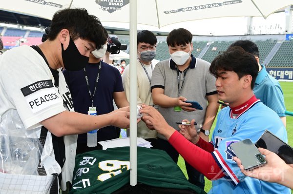 16일 서울 잠실야구장에서 열린 ‘2022 KBO 올스타전’ 드림 올스타와 나눔 올스타의 경기에 앞서 SSG 김광현이 팬 사인회에서 포즈를 취하고 있다.