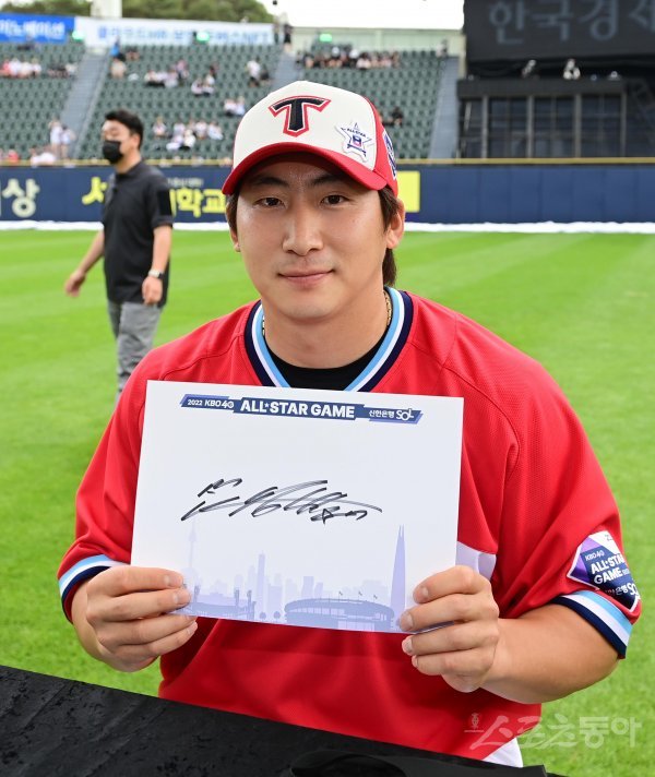 16일 서울 잠실야구장에서 열린 ‘2022 KBO 올스타전’ 드림 올스타와 나눔 올스타의 경기에 앞서 KIA 나성범이 팬 사인회에서 포즈를 취하고 있다.