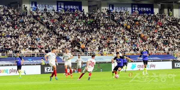 16일 경기도 수원월드컵경기장에서 잉글랜드 프로축구 프리미어리그 ‘토트넘’과 스페인 프로축구 ‘세비야’의 경기가 열렸다. 관중석을 가득메운 축구팬들이 토트넘 손흥민의 플레이를 응원하고 있다.