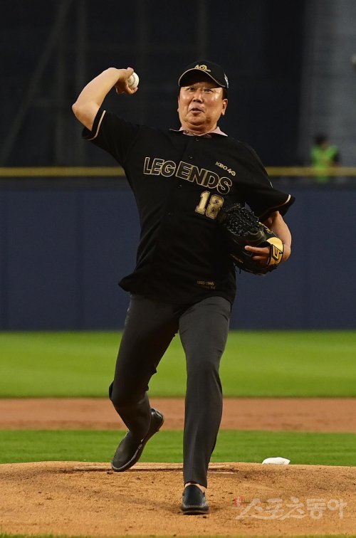 16일 서울 잠실야구장에서 열린 ‘2022 KBO 올스타전’ 드림 올스타와 나눔 올스타의 경기에 앞서 선동열이 마운드에 올라 레전드 시구를 하고 있다. 잠실 | 주현희 기자 teth1147@donga.com