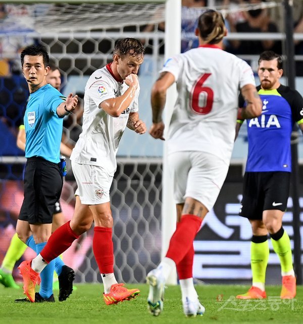 16일 경기도 수원월드컵경기장에서 잉글랜드 프로축구 프리미어리그 ‘토트넘’과 스페인 프로축구 ‘세비야’의 경기가 열렸다. 세비야 라키티치가 동점 골을 넣은 후 세리머니를 펼치고 있다.