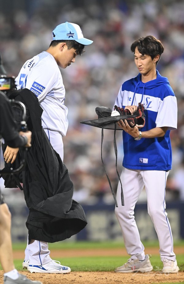 16일 서울 잠실야구장에서 열린 ‘2022 KBO 올스타전’ 드림 올스타와 나눔 올스타의 경기에서 6회초 드림올스타 이승현이 저승사자 복장으로 마운드에 오른 후 옷을 벗고 있다.
