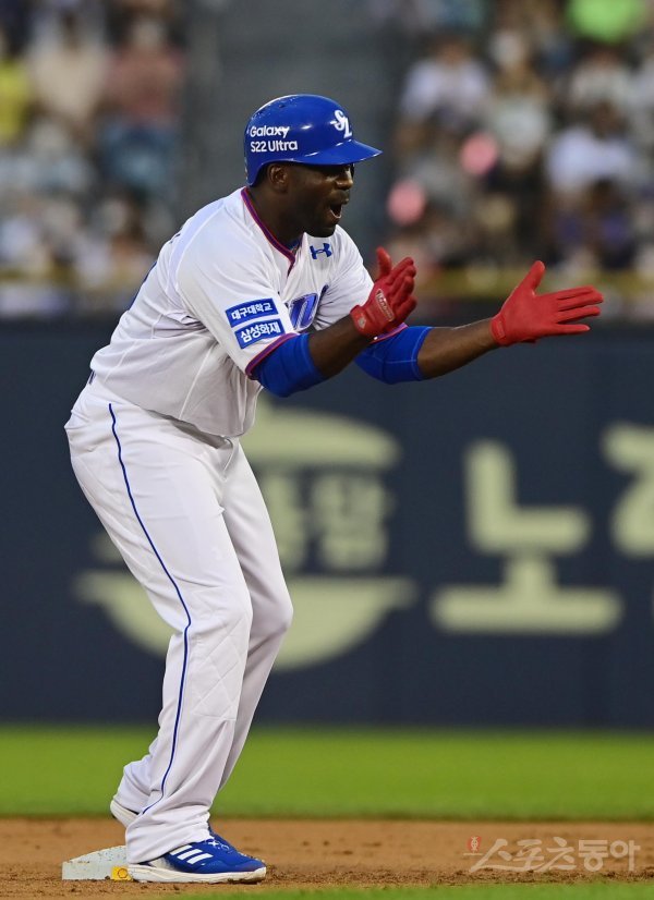 16일 서울 잠실야구장에서 열린 ‘2022 KBO 올스타전’ 드림 올스타와 나눔 올스타의 경기에서 1회말 무사 삼성 피렐라가 우전 2루타를 친 후 손뼉을 치고 있다.
